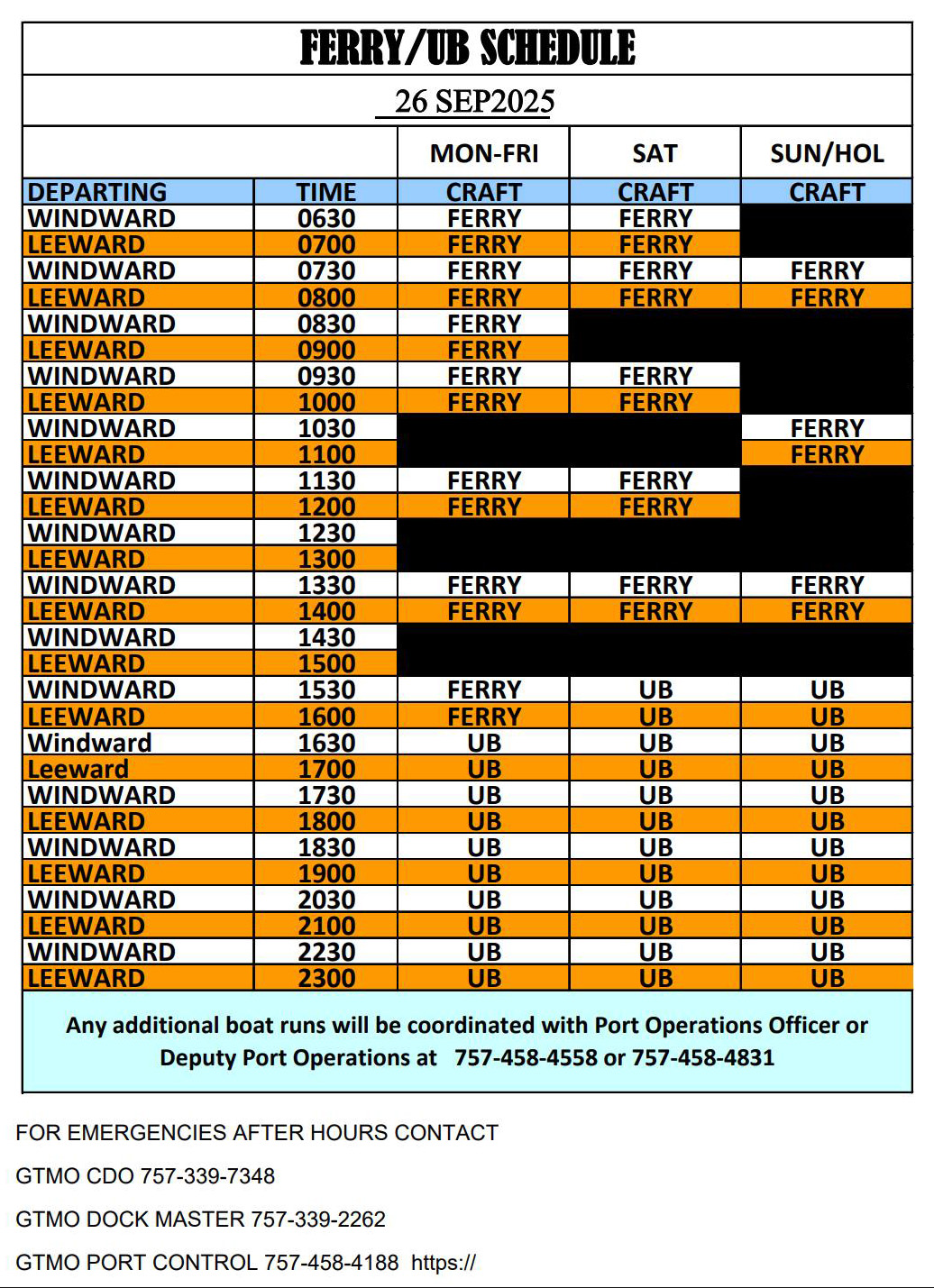 Any additional boat runs will be coordinated with the Port Operations Officer: (757) 458-4558 / 4831